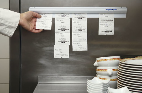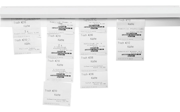 Catch-Ball terminal strip for pinning notes, plans, waiter bills, drawings or photos. The clamp rail will be great wherever you need a quick exchange of information, e.g. in the restaurant's kitchen.