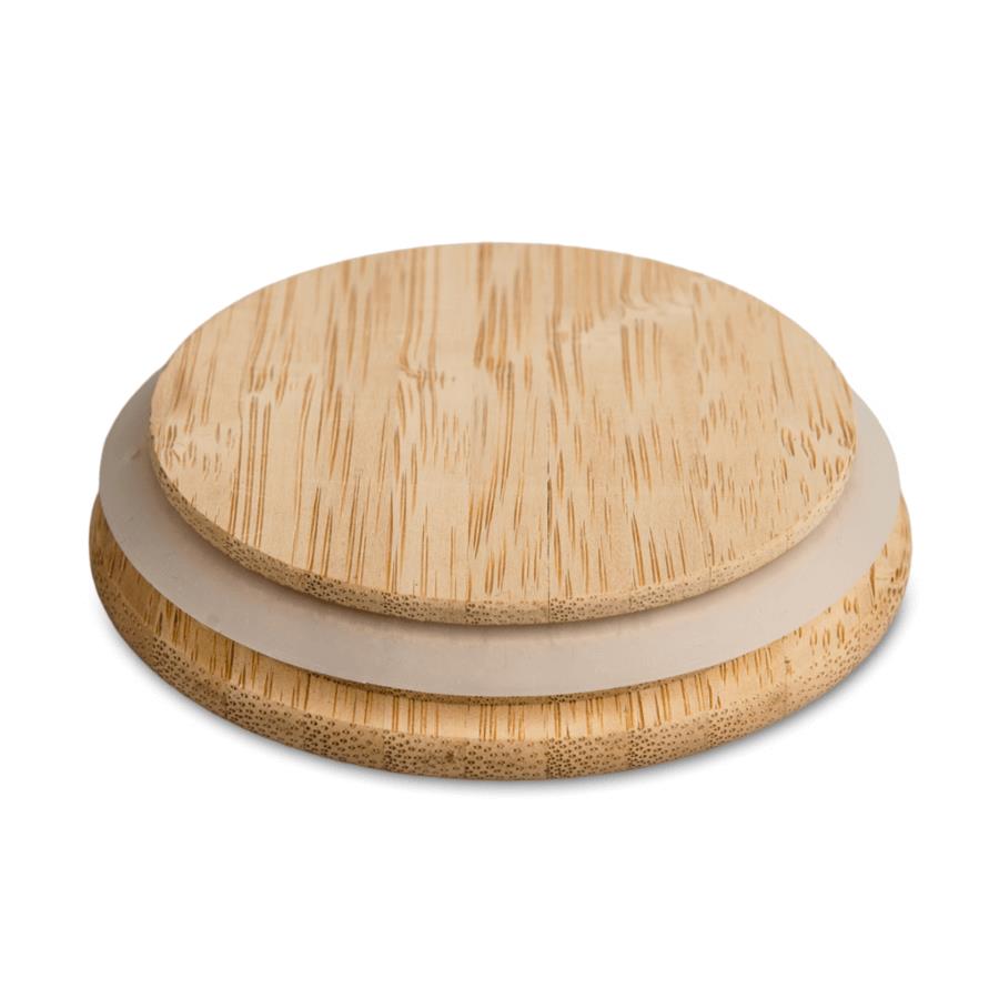 Ceramic jar with a polyester-coated surface enabling sublimation printing. The bamboo lid is sealed with a rubber gasket suitable for food storage.