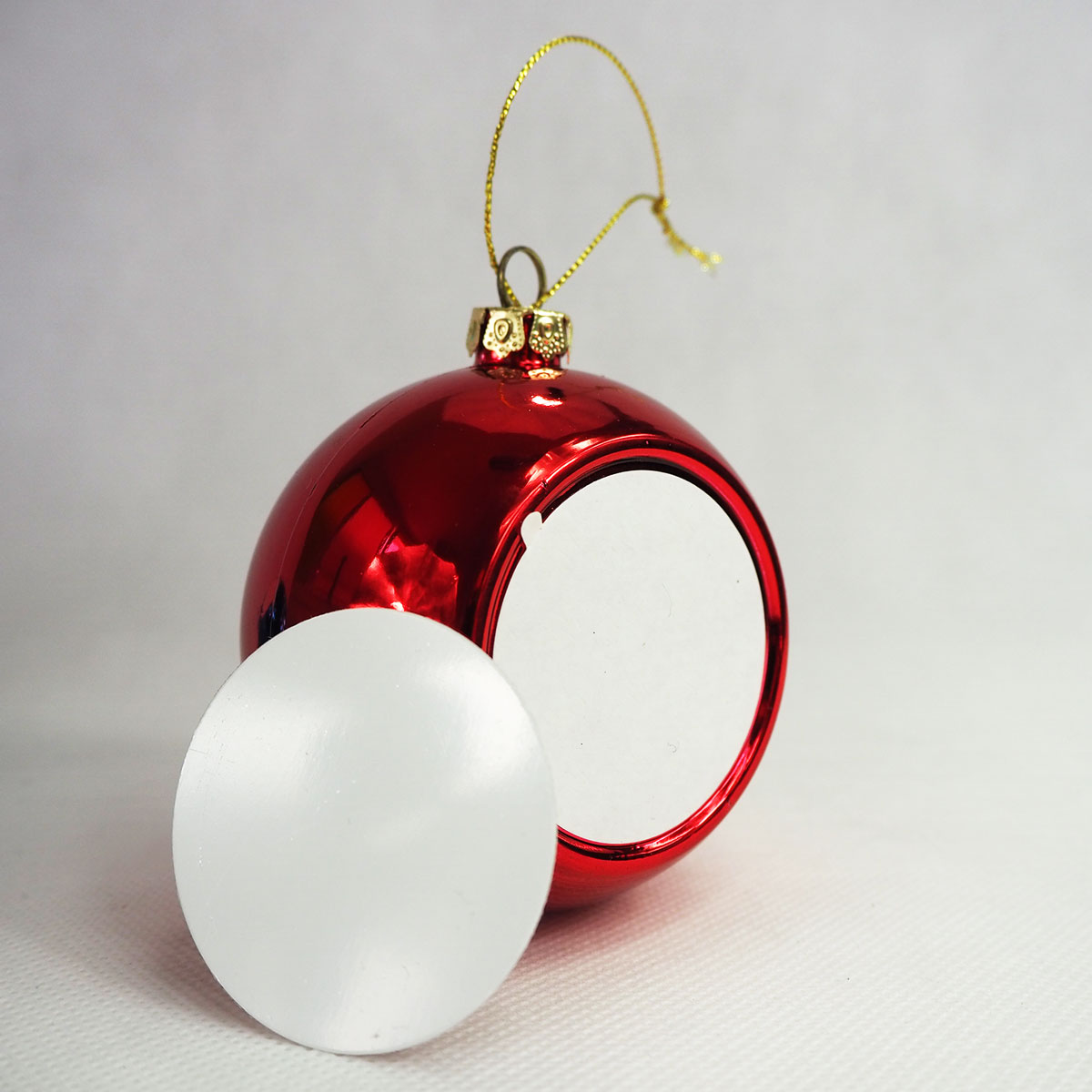 • We can make the sublimation print on a white plate, attached separately to the ball, and then stick it in the center of the designated field. There is a special adhesive tape on the bauble, secured from the outside. Just tear off the cover and stick the sublime disc