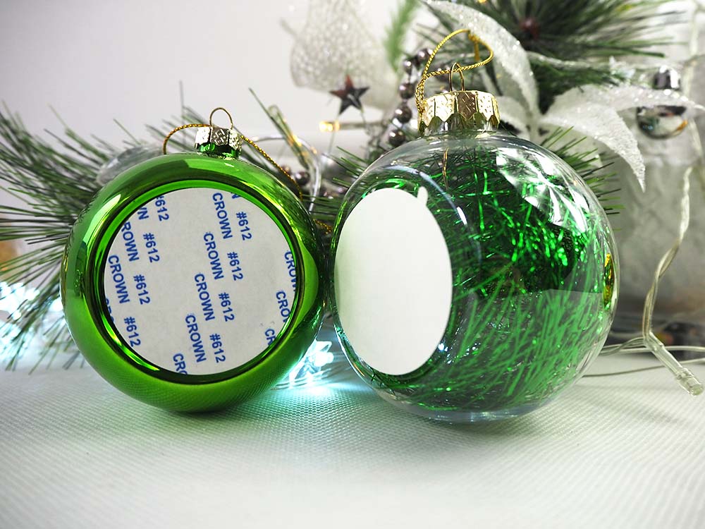 • We can make the sublimation print on a white plate, attached separately to the ball, and then stick it in the center of the designated field. There is a special adhesive tape on the bauble, secured from the outside. Just tear off the cover and stick the sublime disc