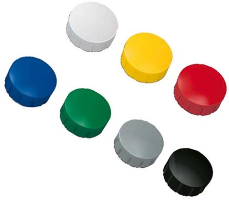 Round MAUL magnets in several colours: 2 each in yellow, red and blue, 1 each in white, green, grey and black with a diameter of 15 mm and a thickness of 7 mm