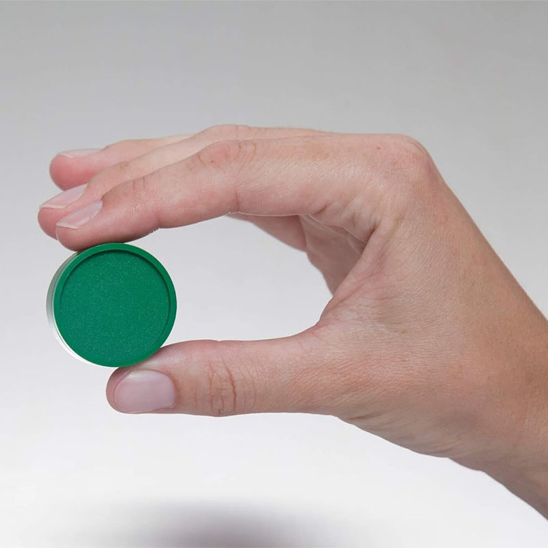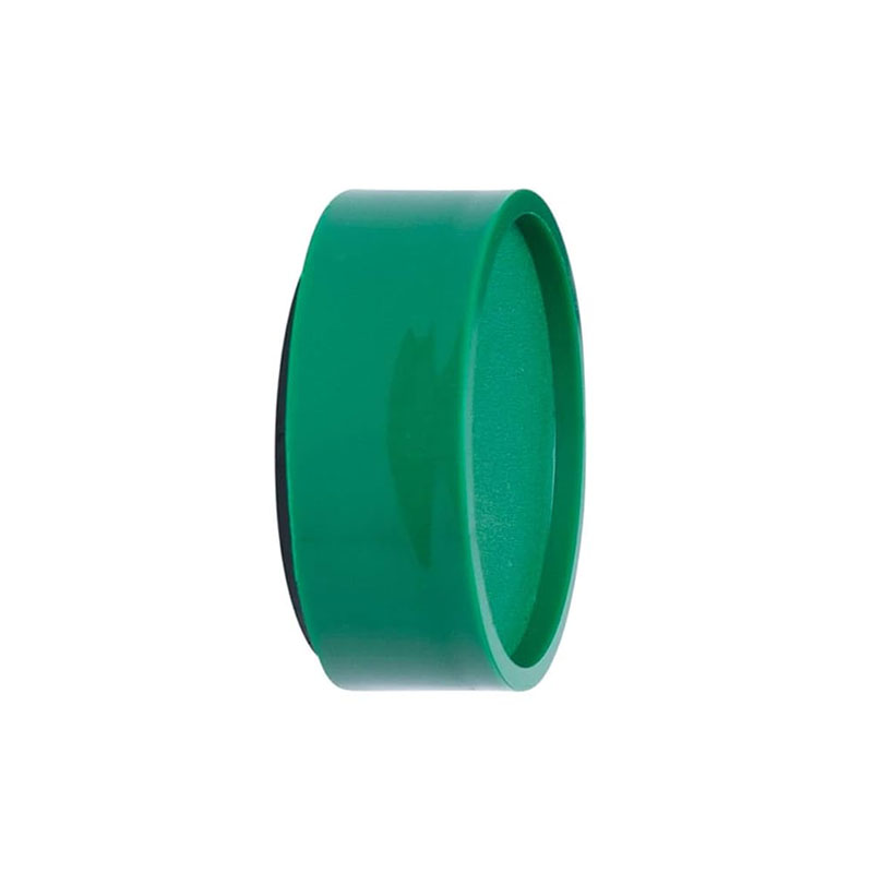 Round, sturdy, industrial magnets in green colour with a diameter of 34 mm and a thickness of 13.8 mm