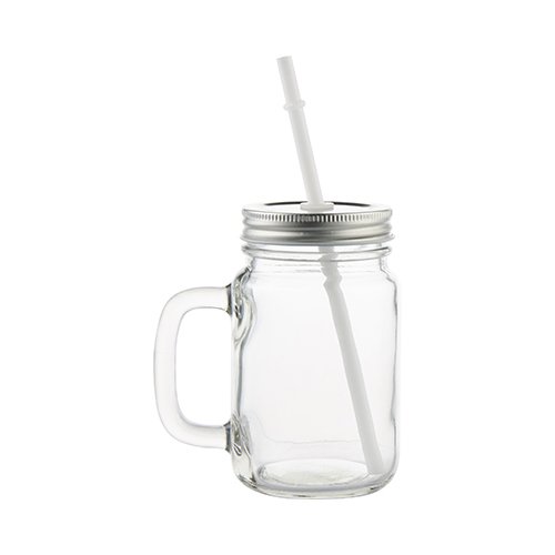 • Glass Mason Jar for sublimation with a large handle, metal screw cap with a hole for a straw and a straw