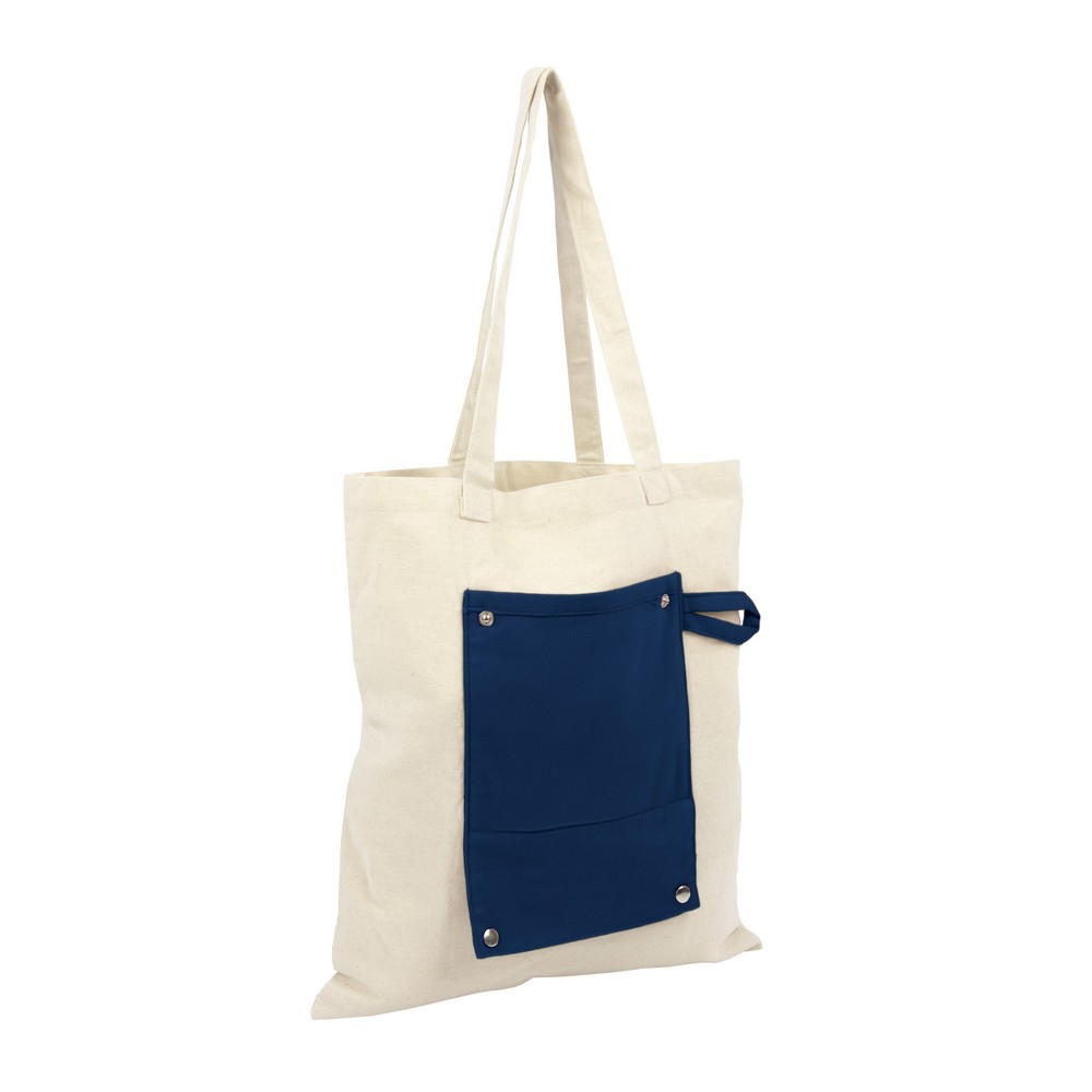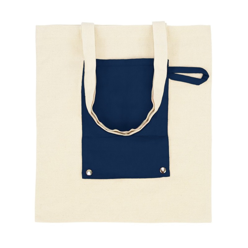 Beige eco-bag has a navy blue front pocket.