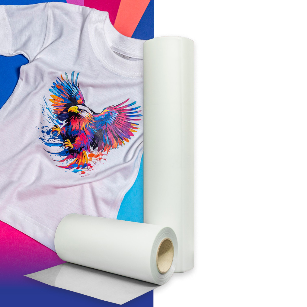 Hot peel DTF film in roll work with all DTF printers, DTF inks and DTF Powder. The process of heat transfer of textile ink to the film can be done on a variety of fabrics (Cotton, Polyester, Leather, Canvas, and more). Not suitable for impregnated and sublimation printed or dyed fabrics.