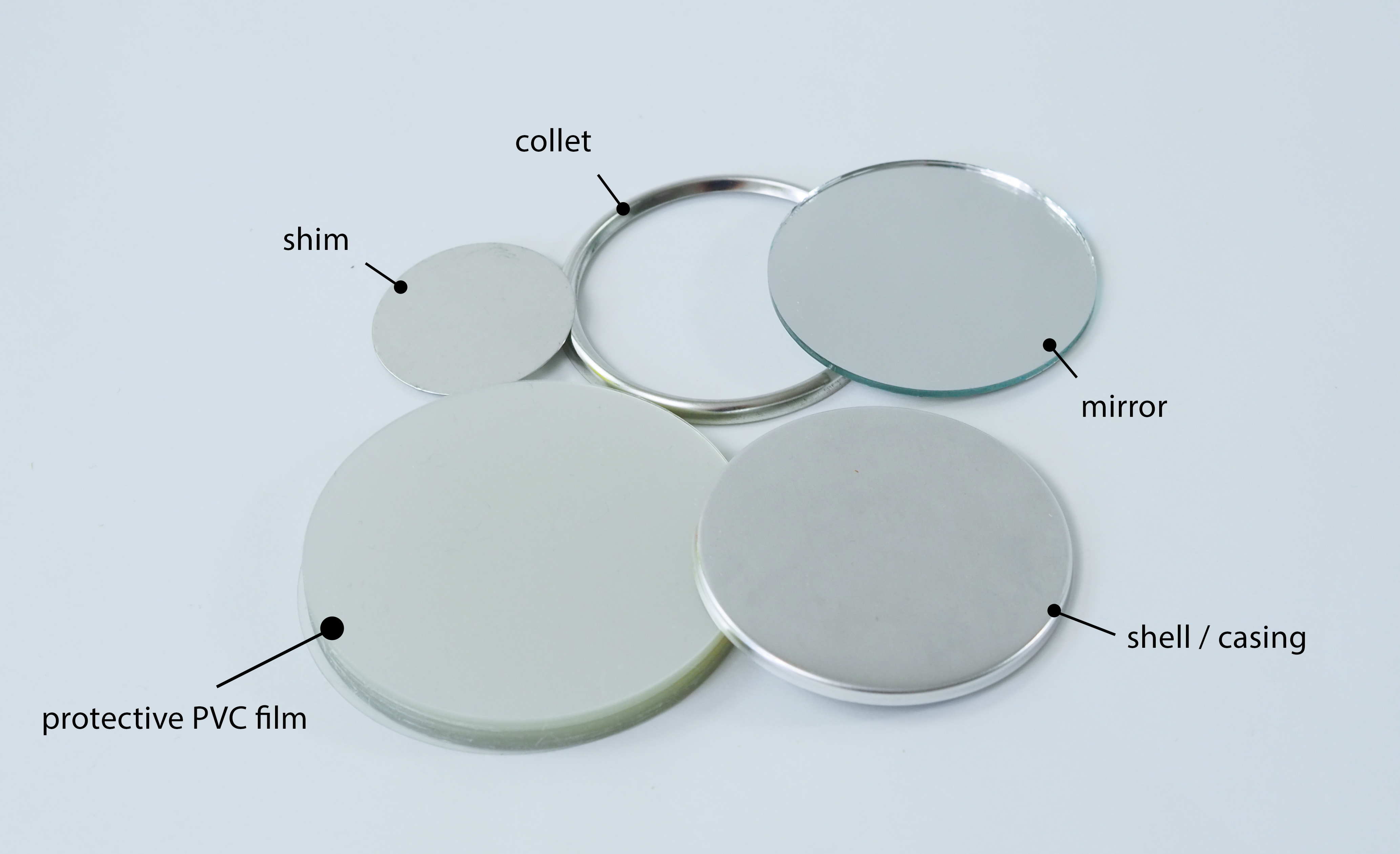 - Components set for the manufacturing of 100 mirror badges with your own application by 56 mm diameter: