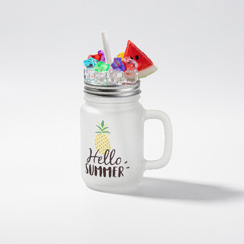 • Frosted glass mug Mason Jar for sublimation with a large handle, metal screw cap decorated with artificial ice and watermelon with a hole for a straw and a straw