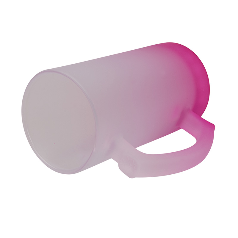 Frosted glass geer mug for sublimation with a unique pink gradient. The shaded transition of colors from white to pink gives it a striking and modern look.
