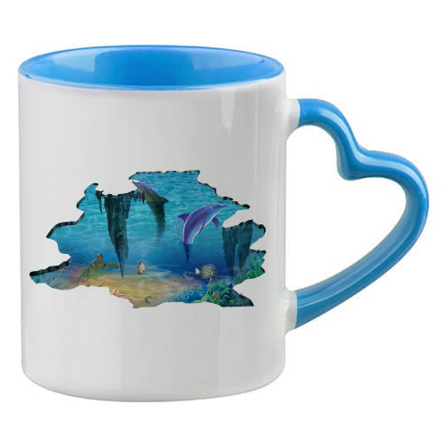White mug with colour inside and heart-shaped handle, coated with a special polyester for sublimation printout.