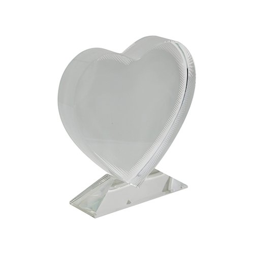 • A heart-shaped acrylic statuette for sublimation is mounted on a transparent base