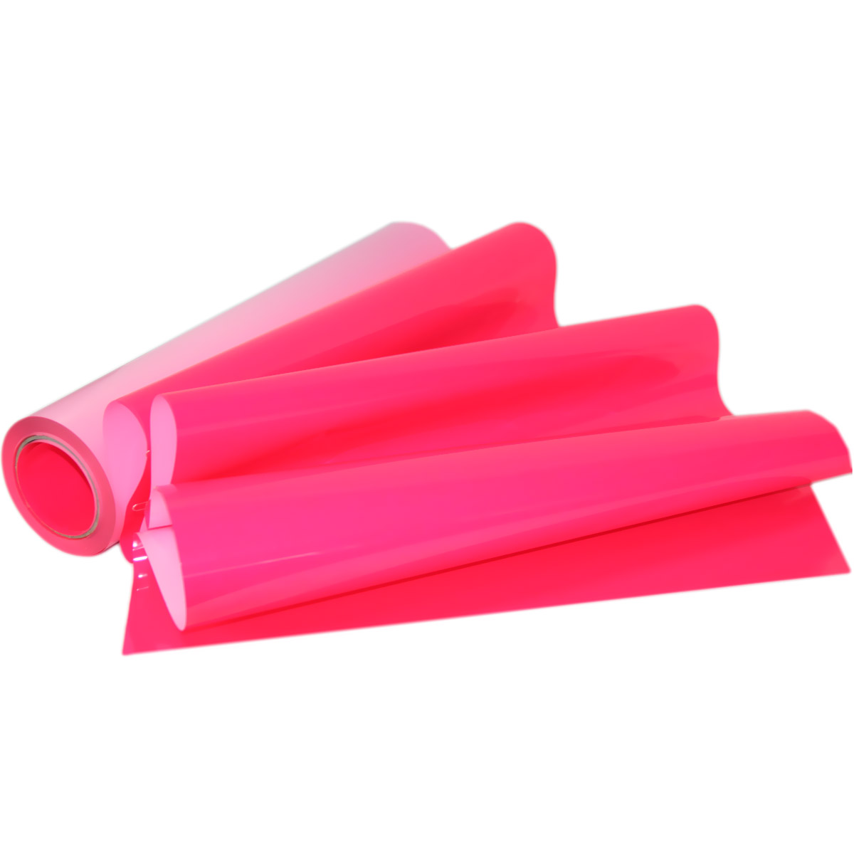 Heat transfer film for cutting plotters neon colour. It is made of a high quality semi matt vinyl foil, laminated with a thermally activated glue. It can be used with cotton, polyester-cotton, acryl-polyester. Elastic film with a very soft feel. It does not reflect the light. Certified Oeko-tex label Standard 100.