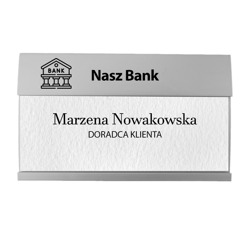 Elegant and functional reusable ID badge made of durable silver aluminum, fastened with a safety pin.