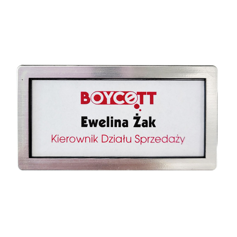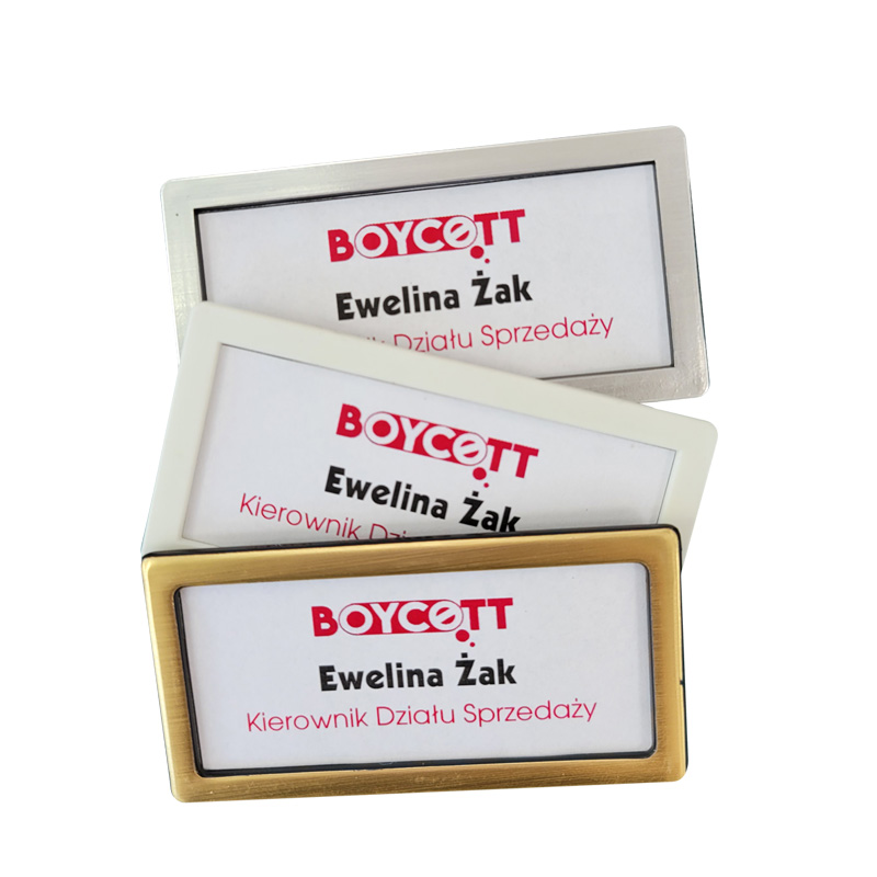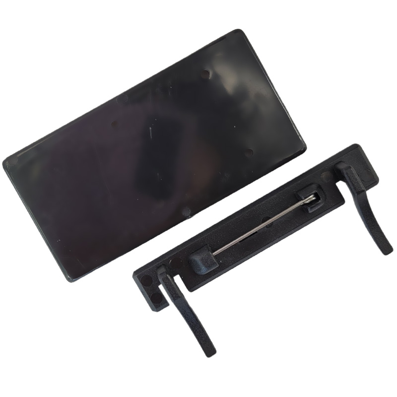 Elegant and functional reusable ID badge made of durable plastic in white, fastened with a safety pin.