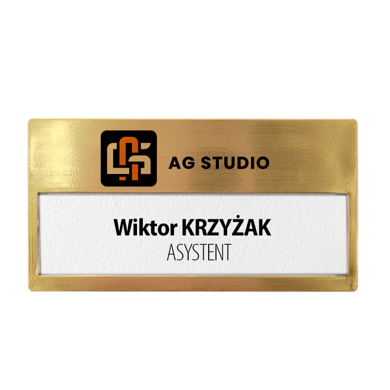 Elegant and functional reusable ID badge made of durable plastic in white, fastened with a safety pin. The front of the badge is finished in gold aluminum.
