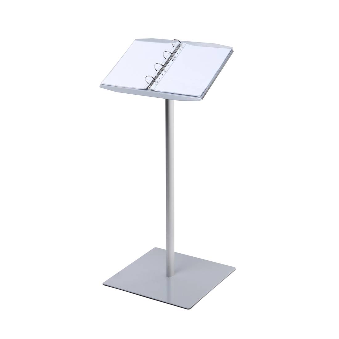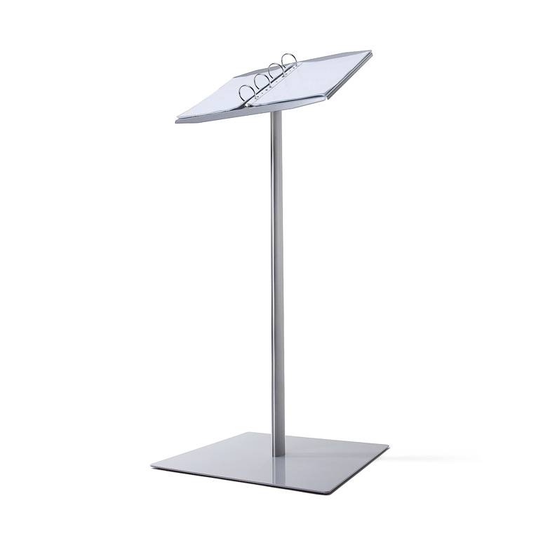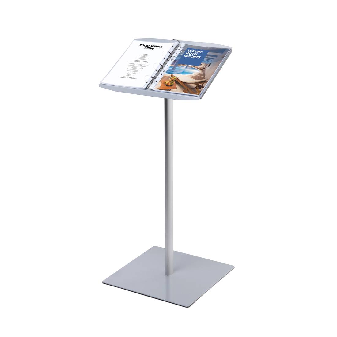 Info Stand with ring binder mechanism for A4 pages. Ideal for menus and price lists. Suitable for indoor use with a heavy steel base. Individual branded versions available upon request.