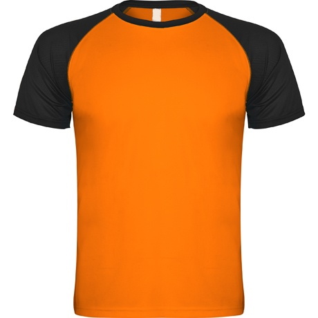 Neon orange T-shirt for a boy with a black sleeve, perfect for sports or marketing events.