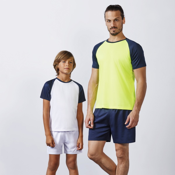 - the sports jersey has short, raglan sleeves in a contrasting color and a round, colored neckline with reinforced covered seams