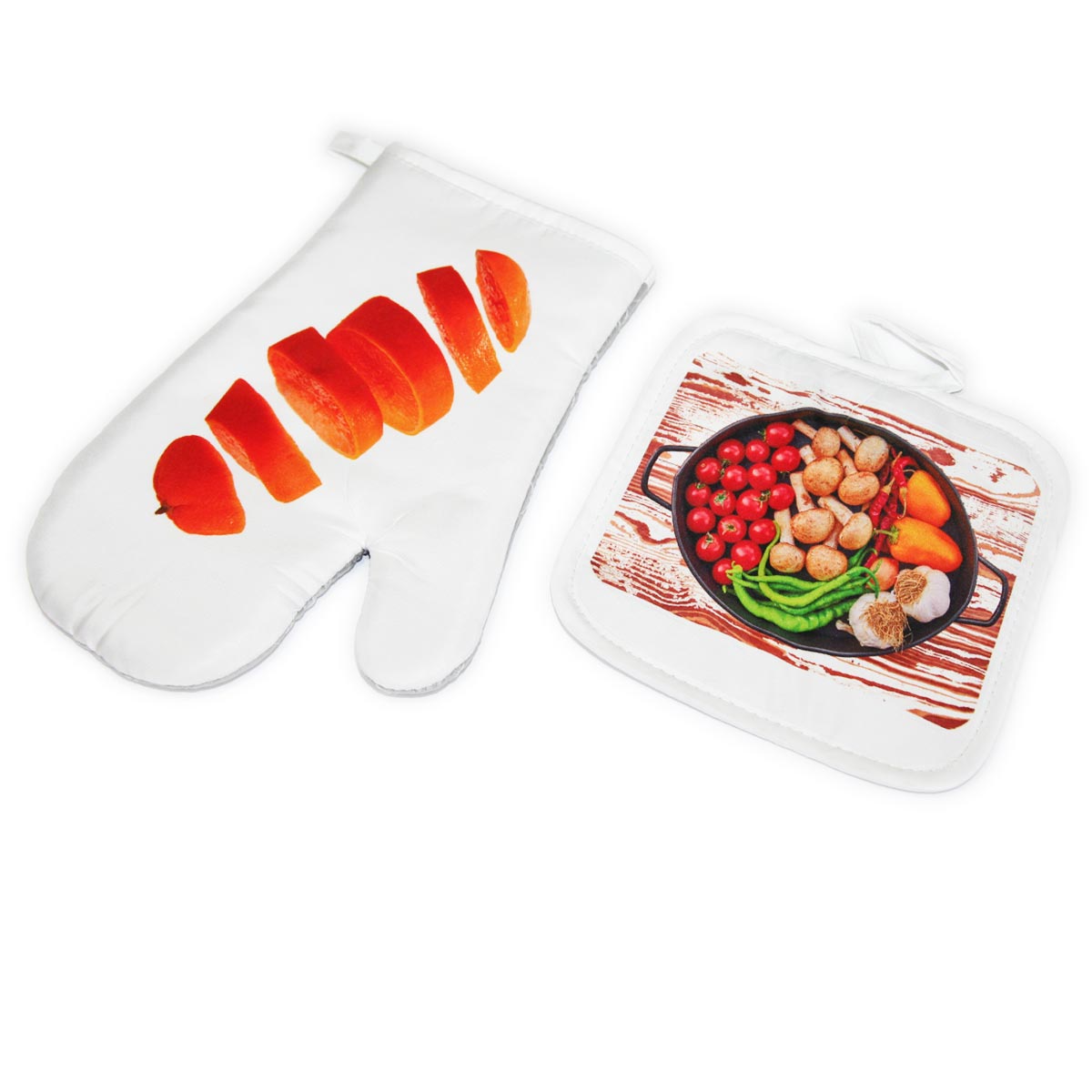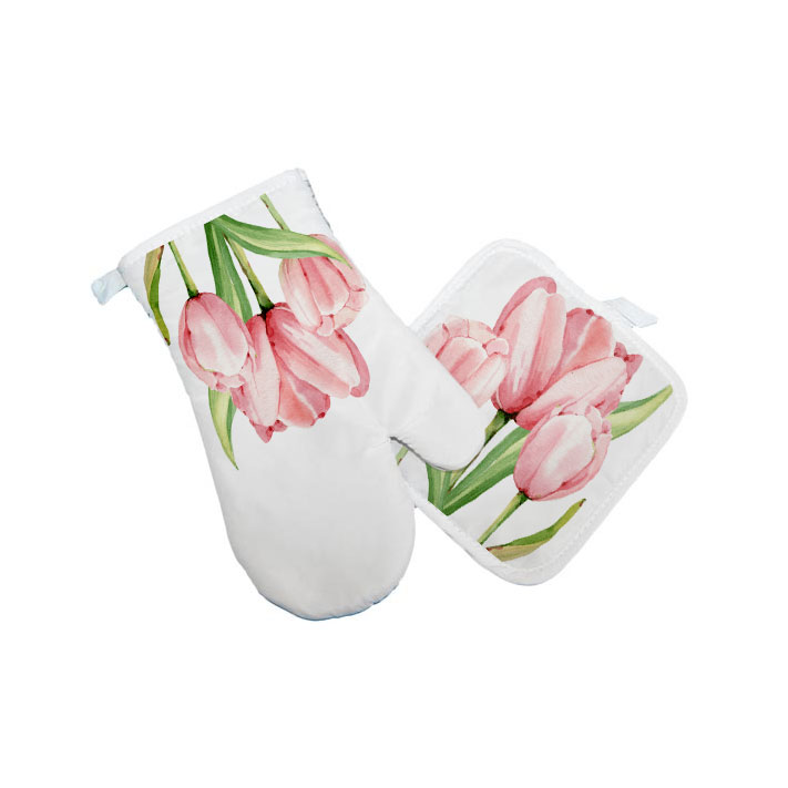 Kitchen cloth and oven glove for sublimation. Set is heat resistant.