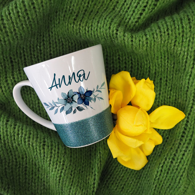 A white latte mug with a blue glitter stripe, great for original prints