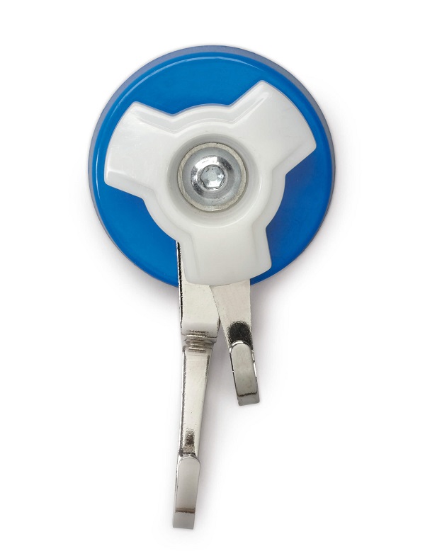 - Strong magnet with two rotating hooks in a blue housing with 56 mm diameter and 12 mm total thickness