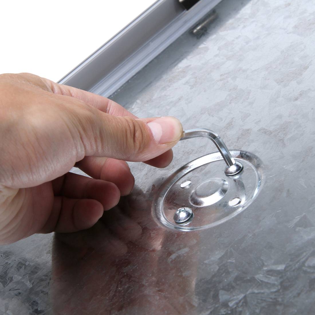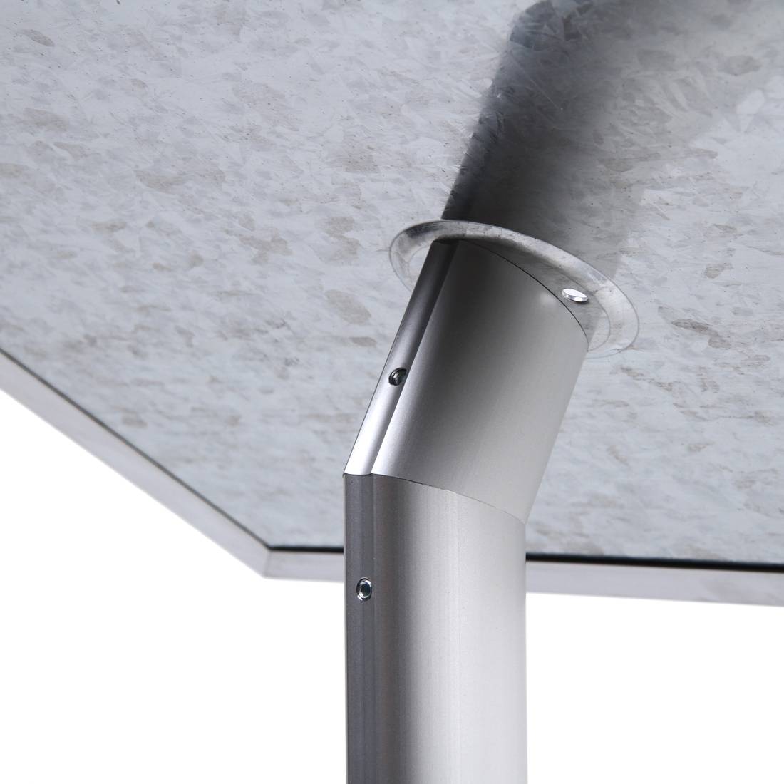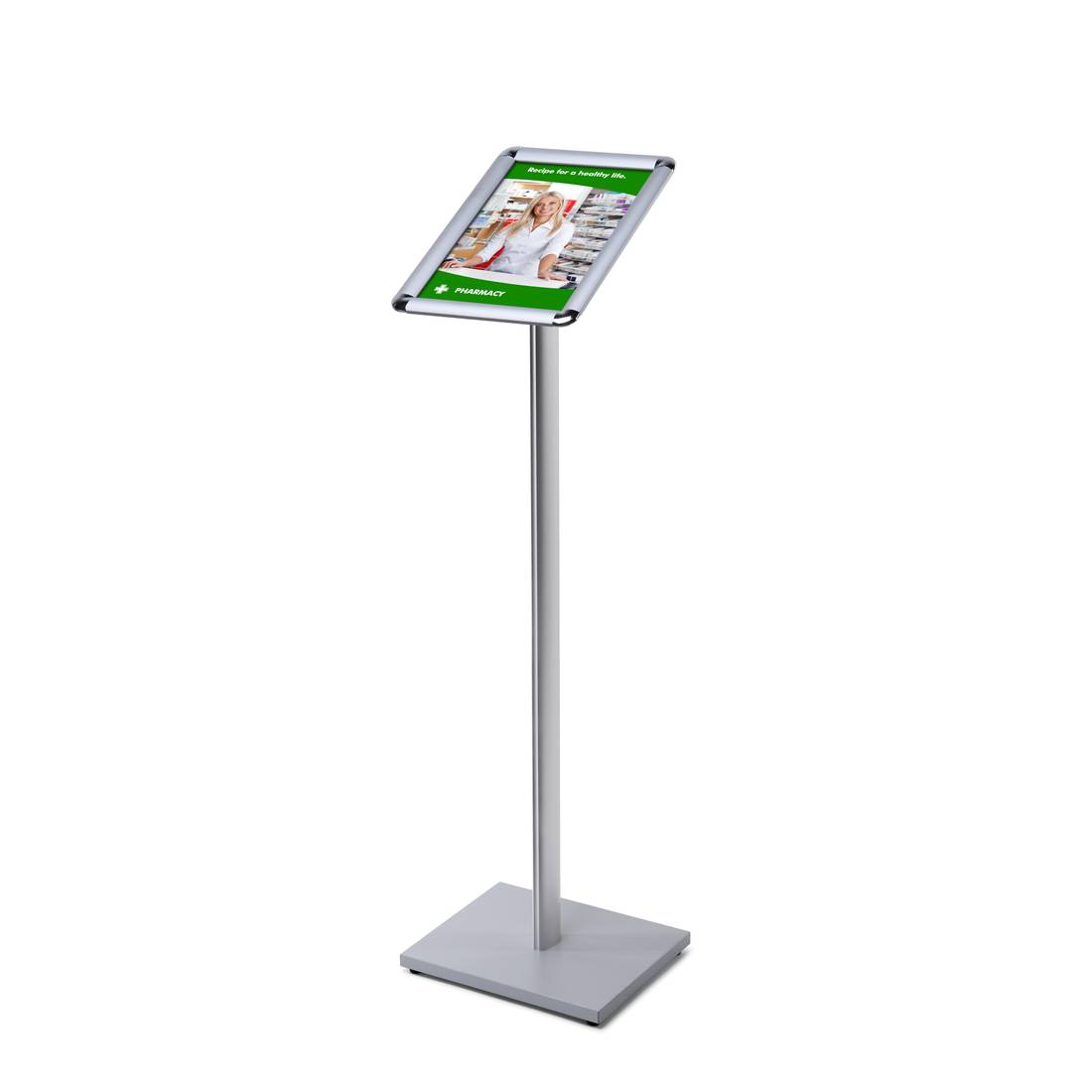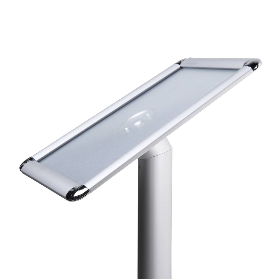 High quality freestanding units with a silver anodised pole and an angled aluminum snap frame to the top. A4 and A3 frames can be rotated for either portrait or landscape orientation. Frames available with either mitred or round corners.