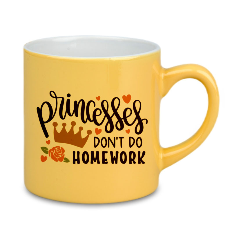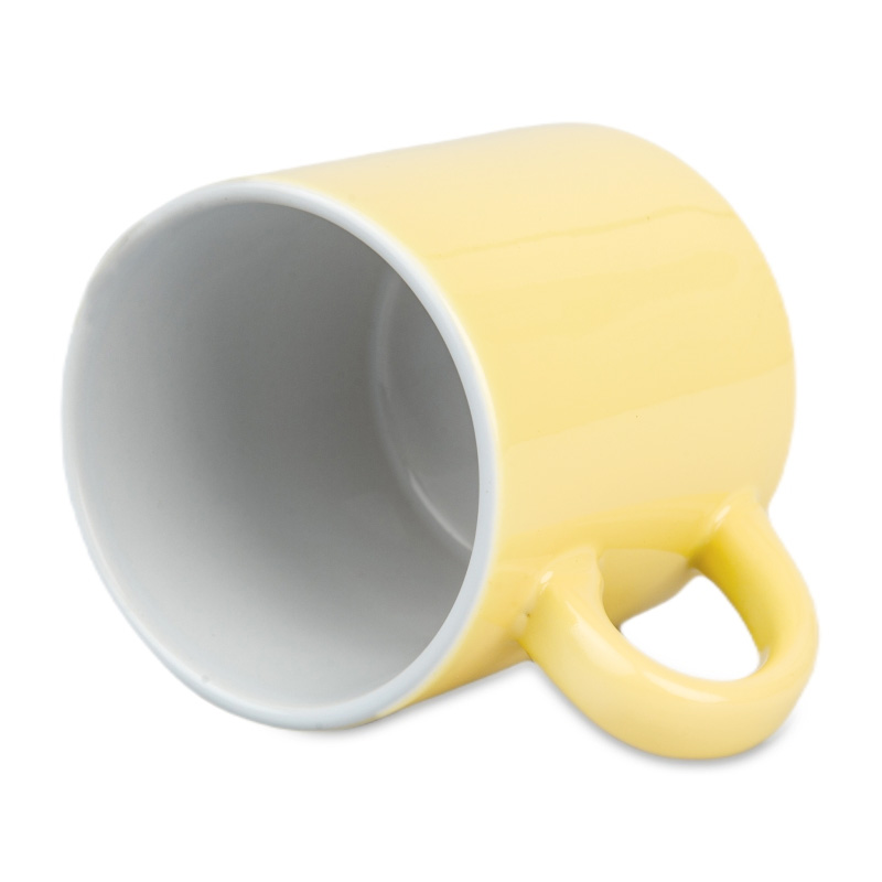 Yellow mini mug is coated with a special polyester for sublimation printout.