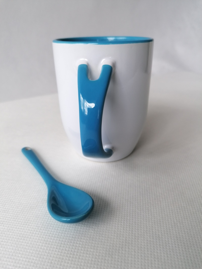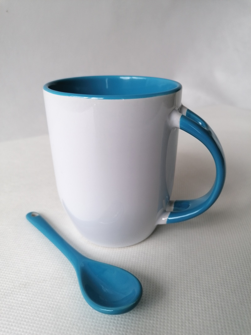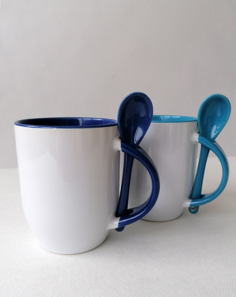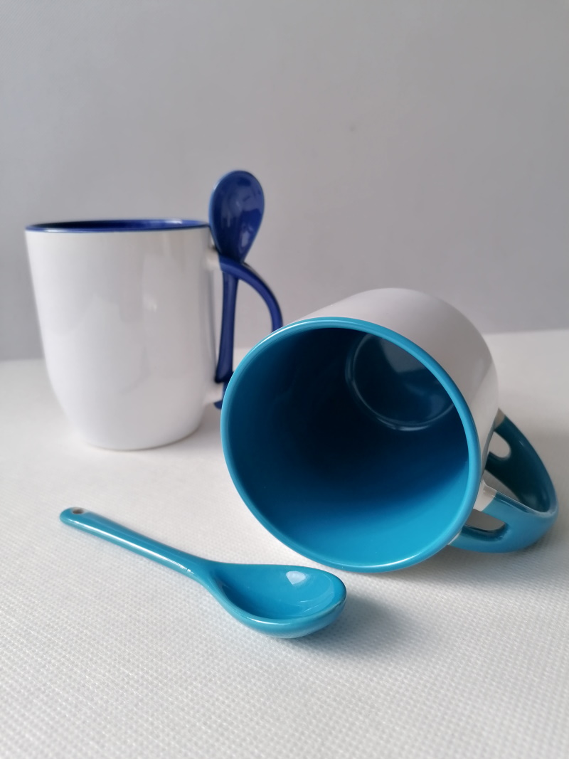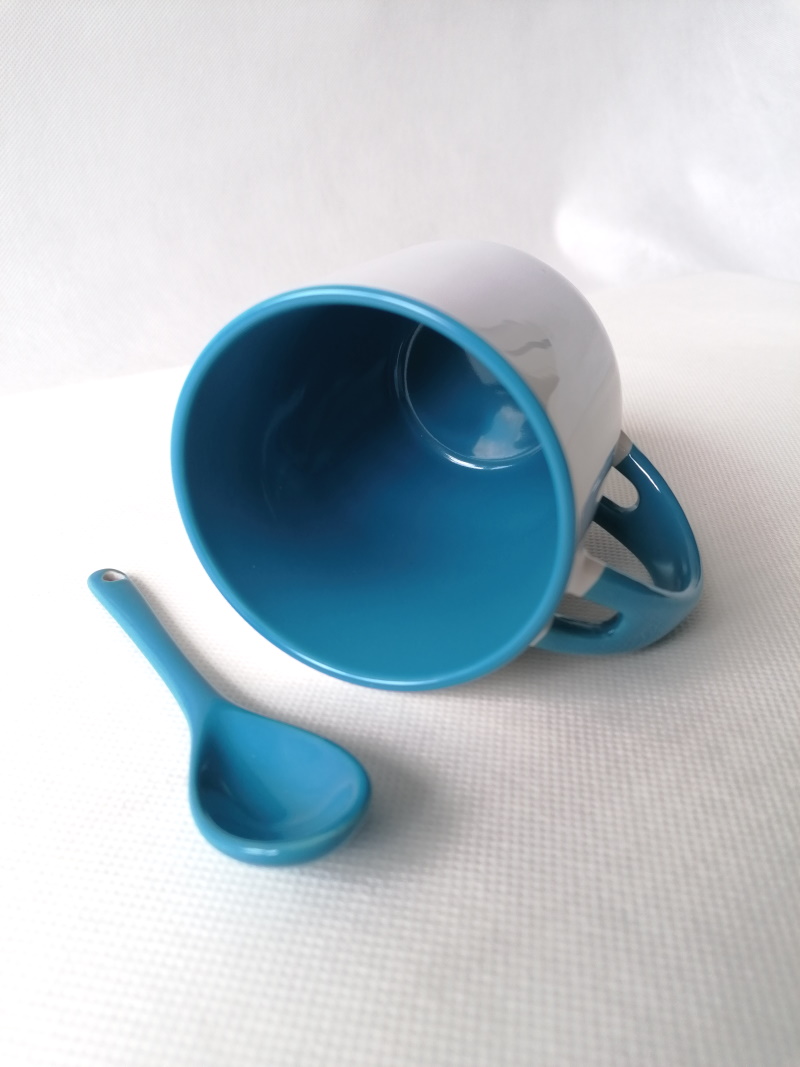 White mug with blue inside, handle and spoon coated with a special polyester for sublimation outprint. Resistant to washing in dishwasher.