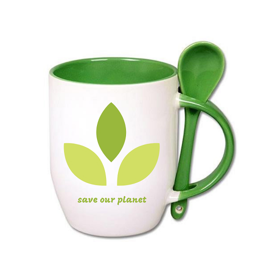 White mug with green inside, handle and spoon coated with a special polyester for sublimation outprint. Resistant to washing in dishwasher.