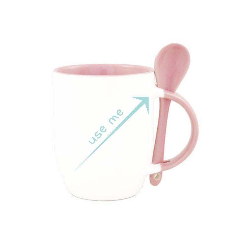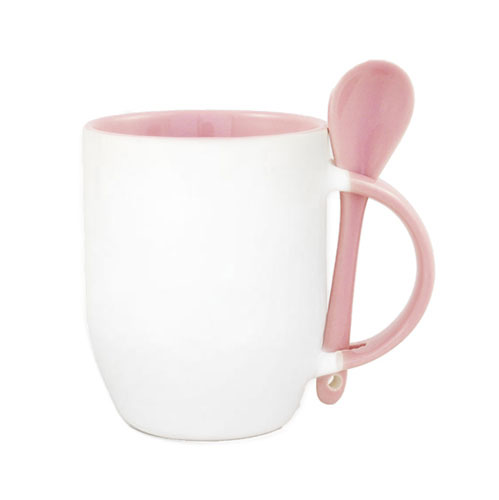 White mug with pink inside, handle and spoon coated with a special polyester for sublimation outprint. Resistant to washing in dishwasher.