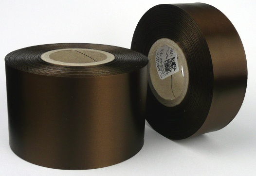 Brown satin ribbon for printing on the TSC TE200 thermal transfer printer. The brown printable ribbon is 2.5 centimeters and wide and is wound on a 50 meter roll.