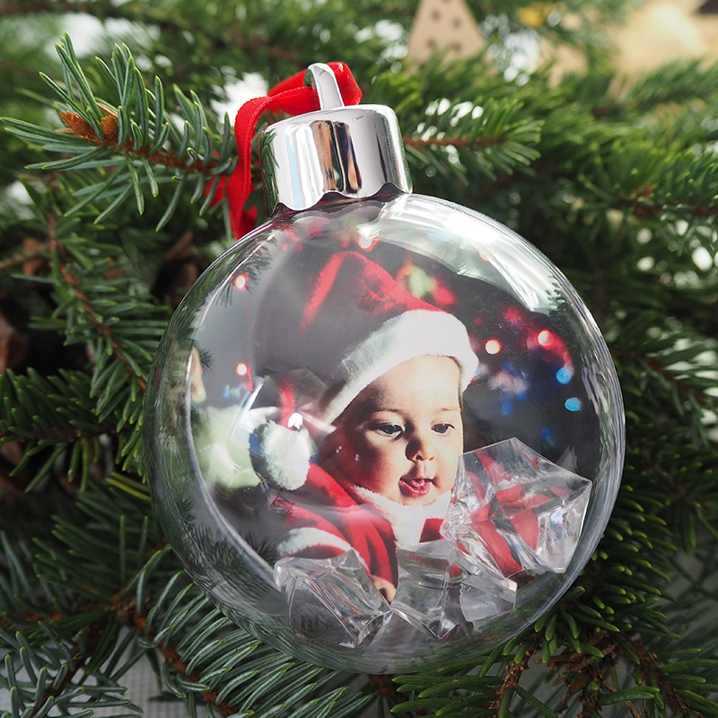 • The shiny Christmas photo baubles to fill with a photo or any other decoration, e.g. with glitter, angel hair or artificial snow / confetti