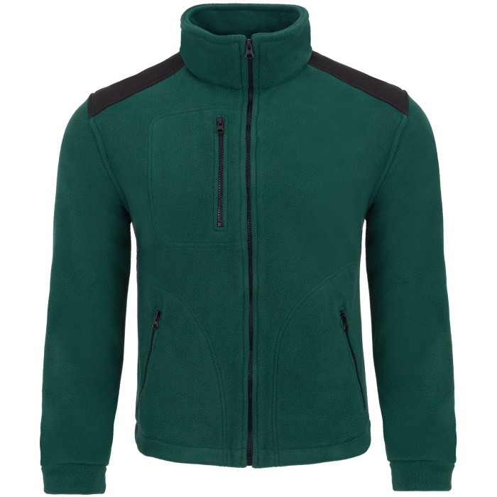 A dark green fleece sweatshirt with black inserts is a great idea for a universal outfit for an evening walk as well as for work in cold days.