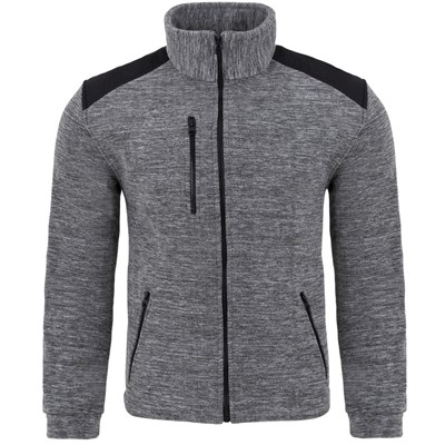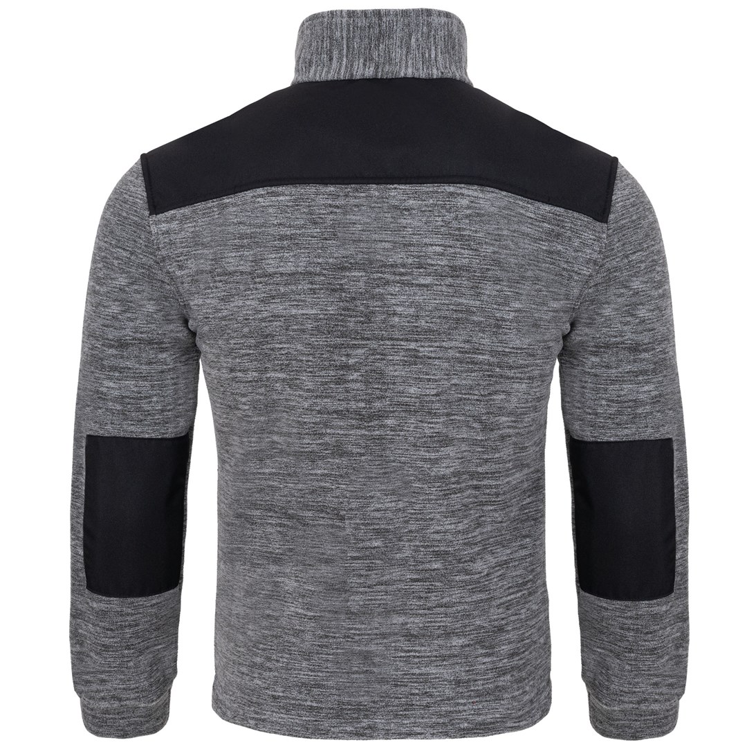 A gray-melange fleece sweatshirt with black inserts is a great idea for a universal outfit for an evening walk as well as for work in cold days.