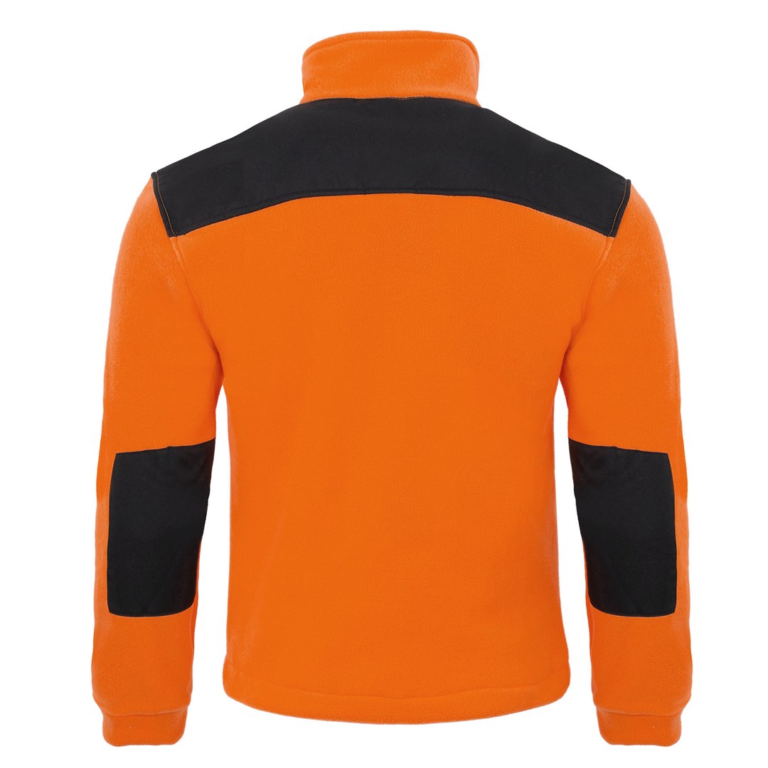 An orange fleece sweatshirt with black inserts is a great idea for a universal outfit for an evening walk as well as for work in cold days.