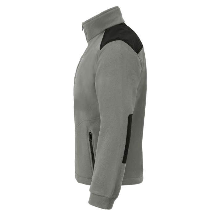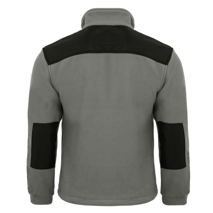 A gray fleece sweatshirt with black inserts is a great idea for a universal outfit for an evening walk as well as for work in cold days.
