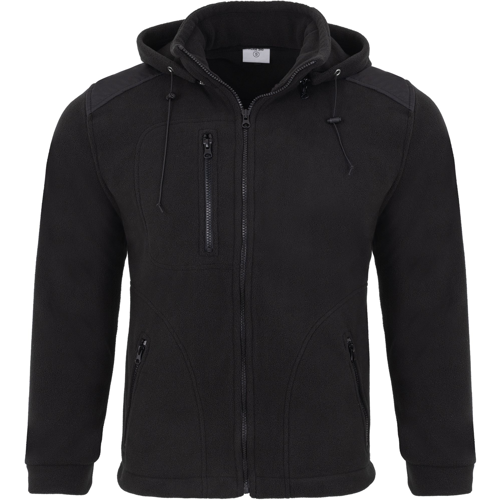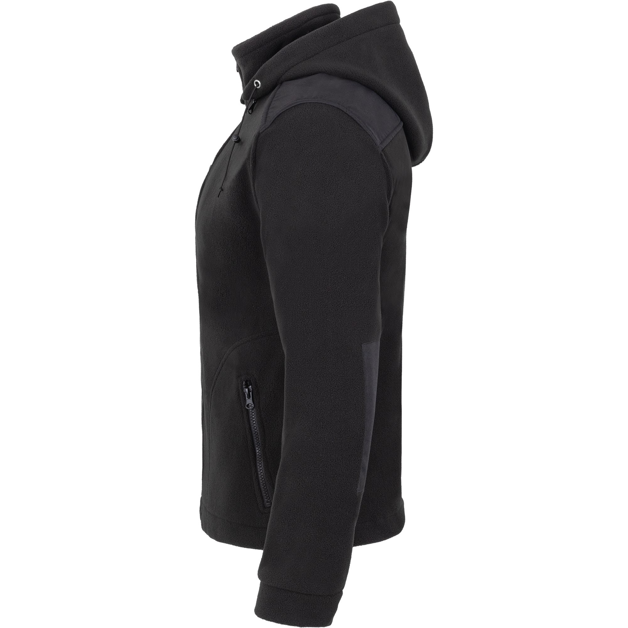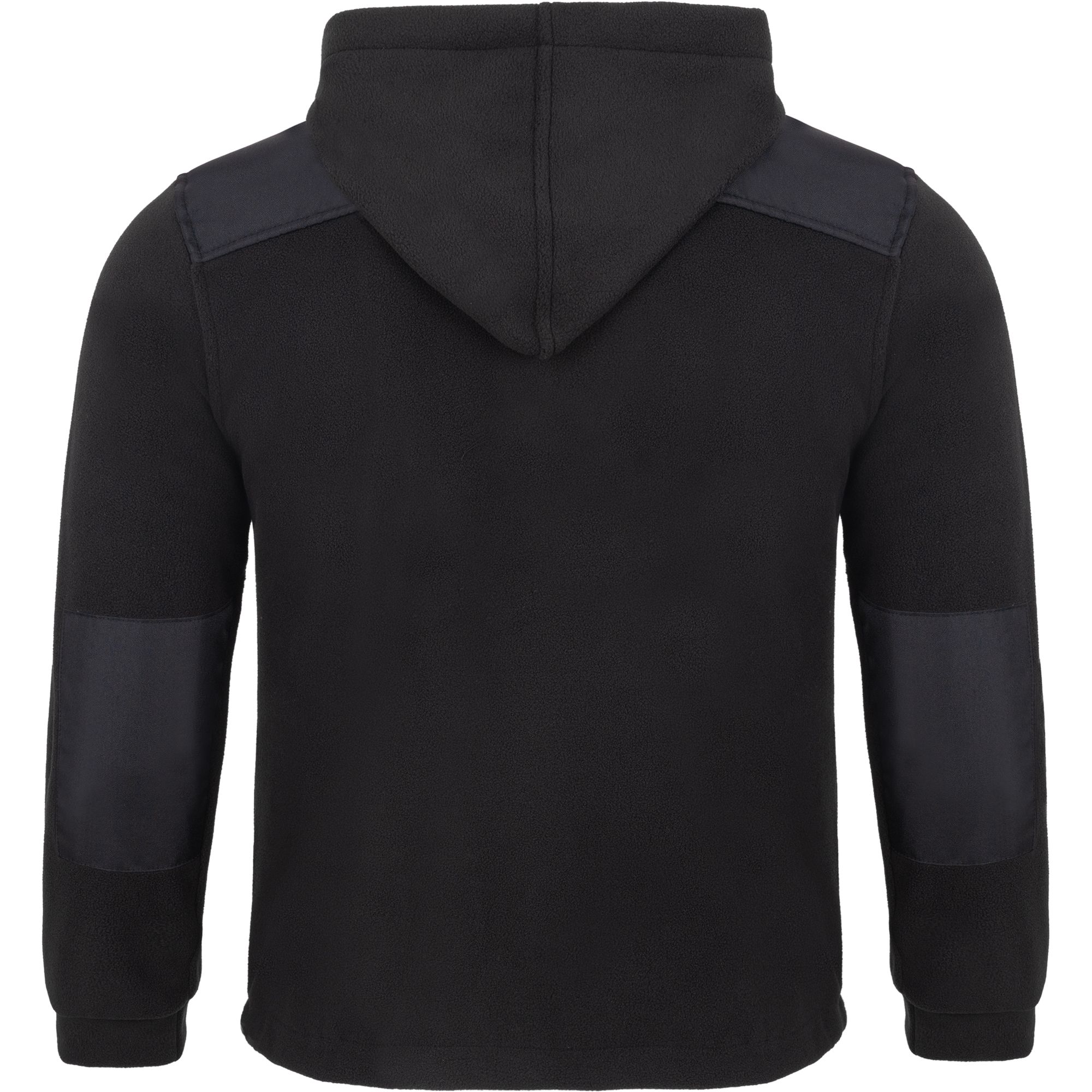 A black blue fleece sweatshirt with a detachable hood and black inserts is a great idea for a universal outfit for an evening walk as well as for work in cold days.