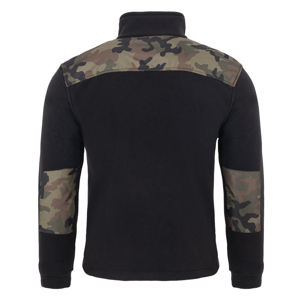 A black fleece sweatshirt with camo inserts is a great idea for a universal outfit for an evening walk as well as for work in cold days.