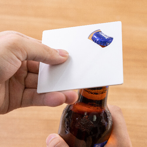 • A bottle opener with custom print serves both promotional and advertising purposes.