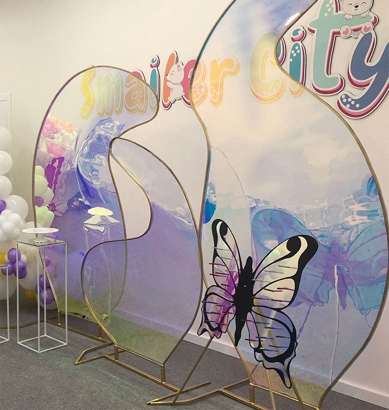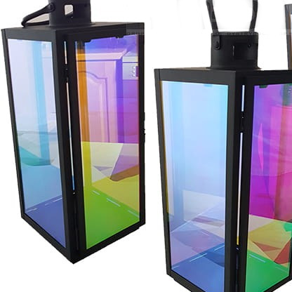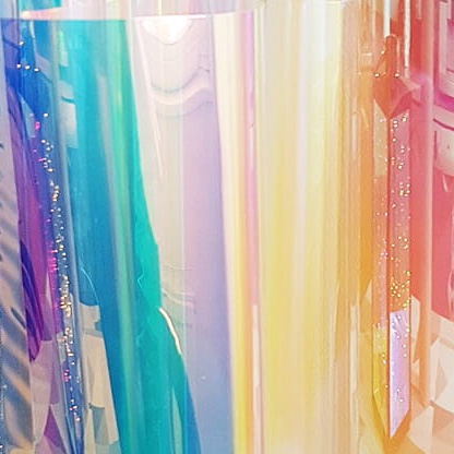 Dichroic vinyls with rainbow effect change color depending on the viewing angle. Rainbow vinyls are perfect to create dichroic lanterns and decorations on glass surfaces. Transparent holographic films can be used on flat glass surfaces, indoors and outdoors. This product is great for applications on showcases, exhibitions and fairs.