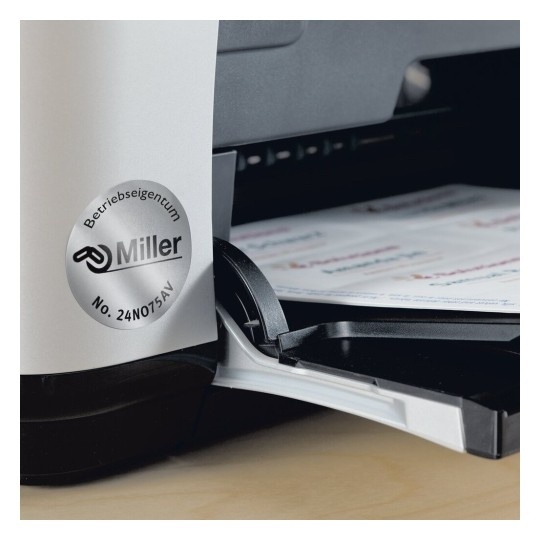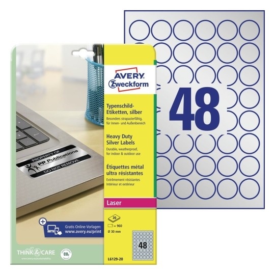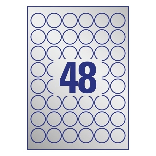 Polyester film is sold in packs of 20 sheets in A4 format (21 x 29.7 cm). Each sheet contains 48 polyester silver sticker, dimensions of label: fi 30 mm