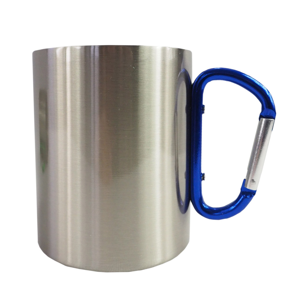Metal inox mug for sublimation outprint with blue handle carabiner type.