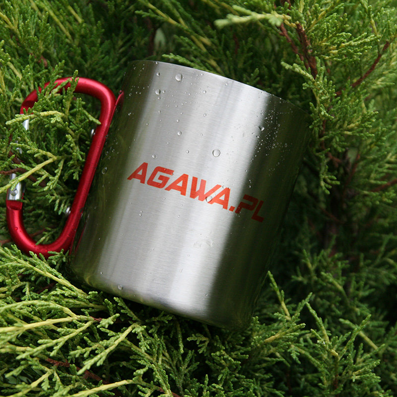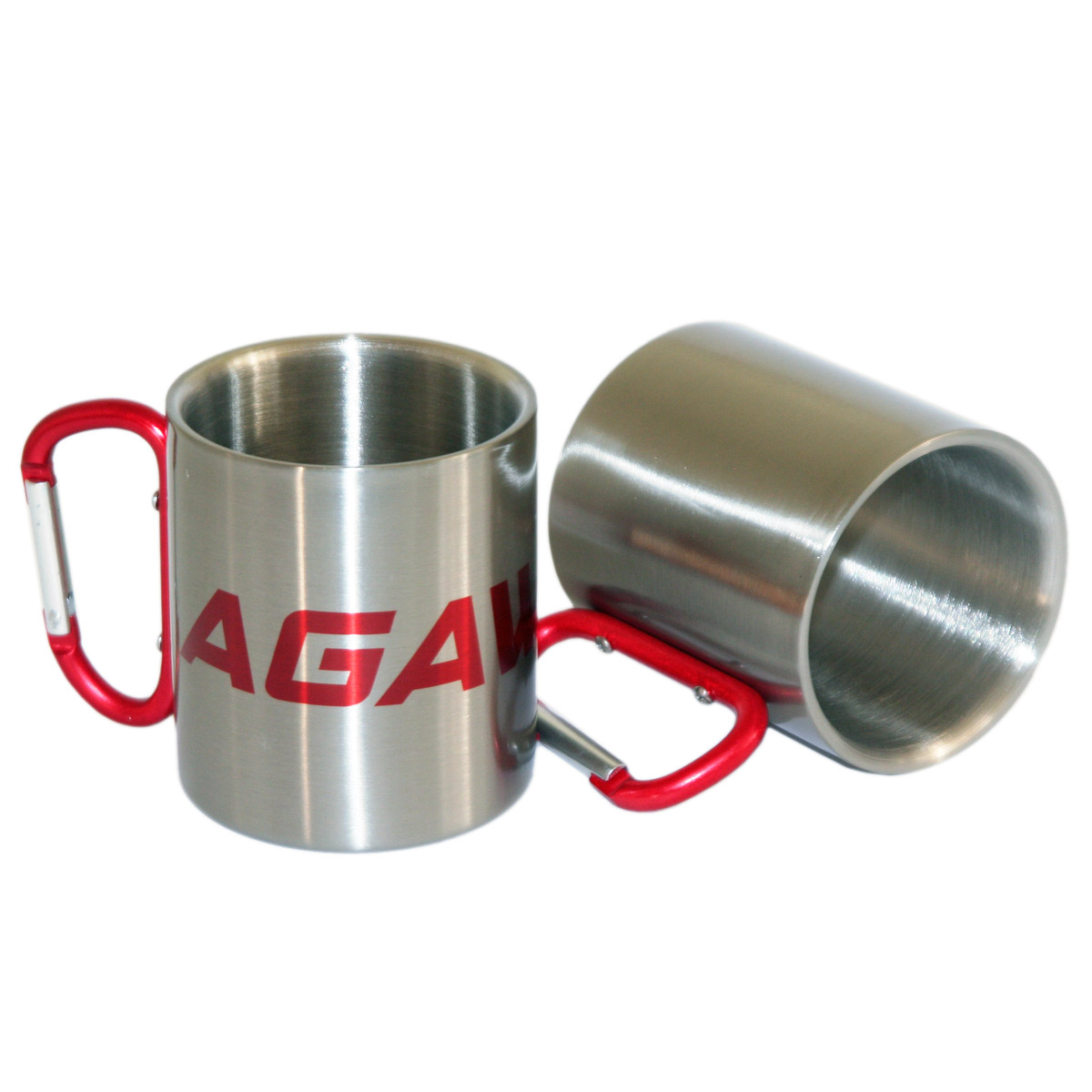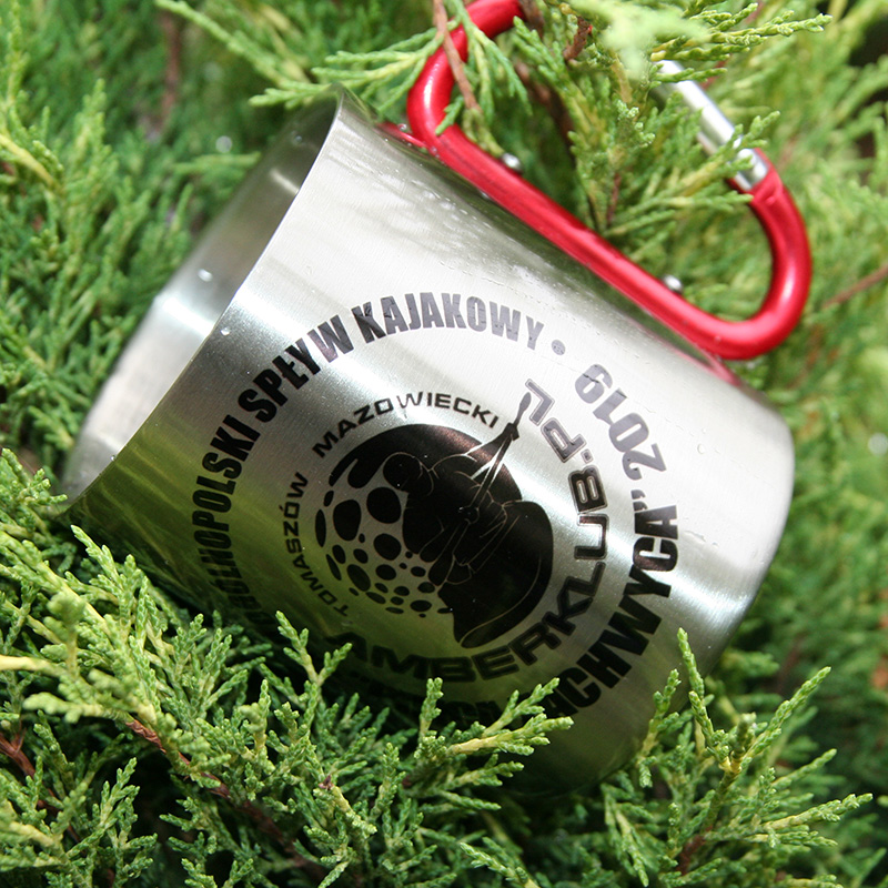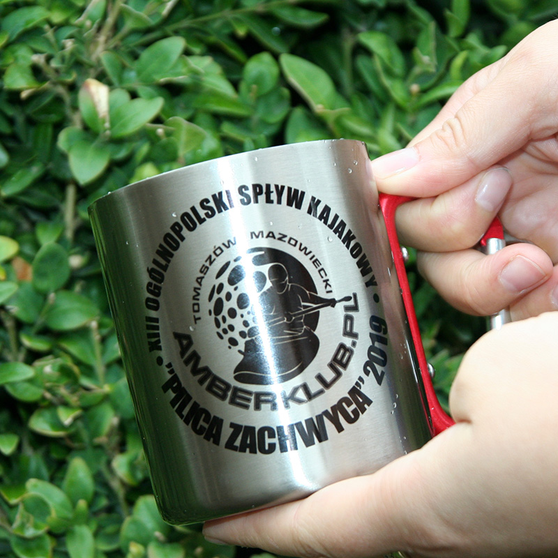 Metal inox mug for sublimation outprint with red handle carabiner type.