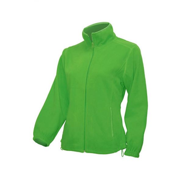 A lime green fleece sweatshirt with a stand-up collar is a great idea for a universal outfit for an evening walk as well as for work in cold days.