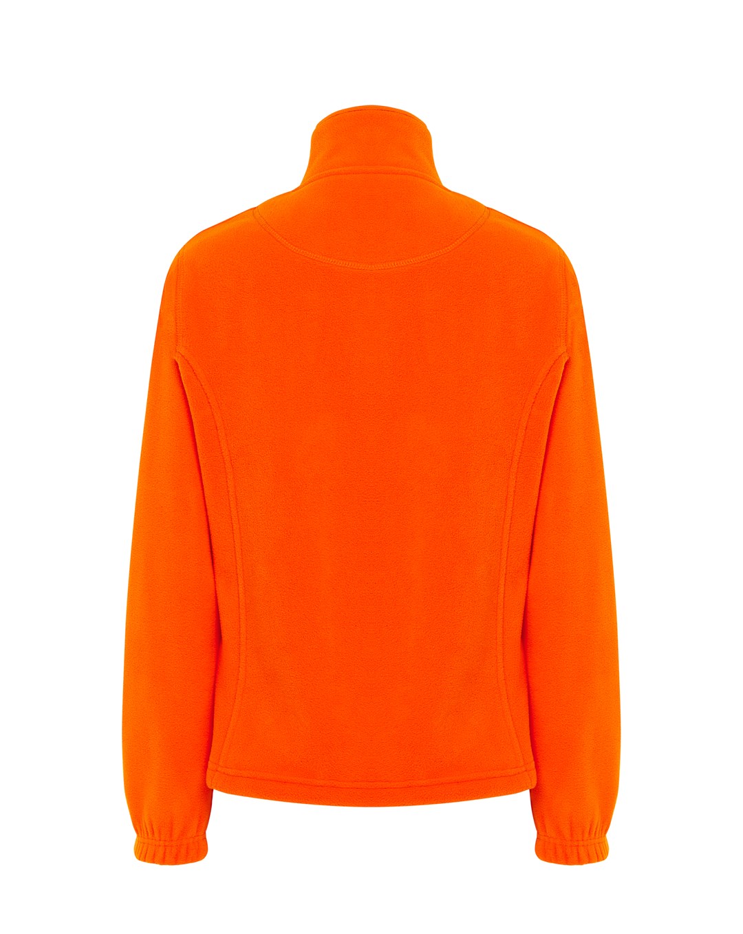 A orange fleece sweatshirt with a stand-up collar is a great idea for a universal outfit for an evening walk as well as for work in cold days.