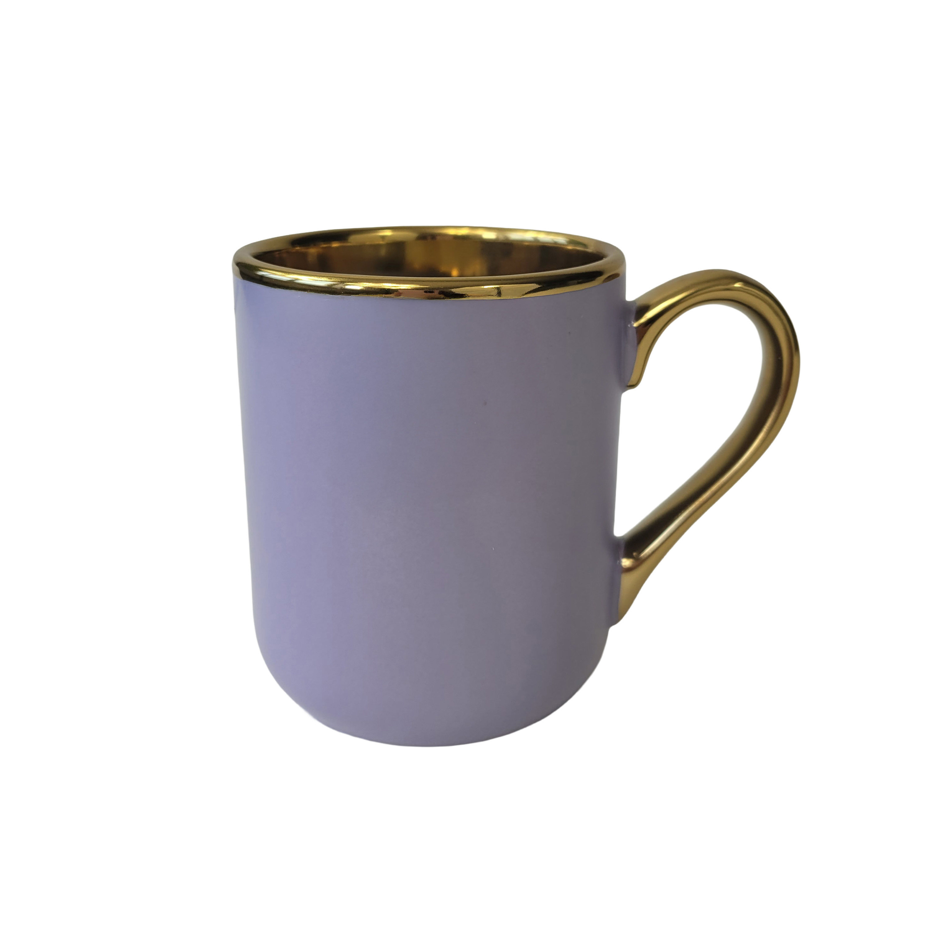 White coffee mug with golden rim and handle, coated with a special polyester for sublimation outprint.