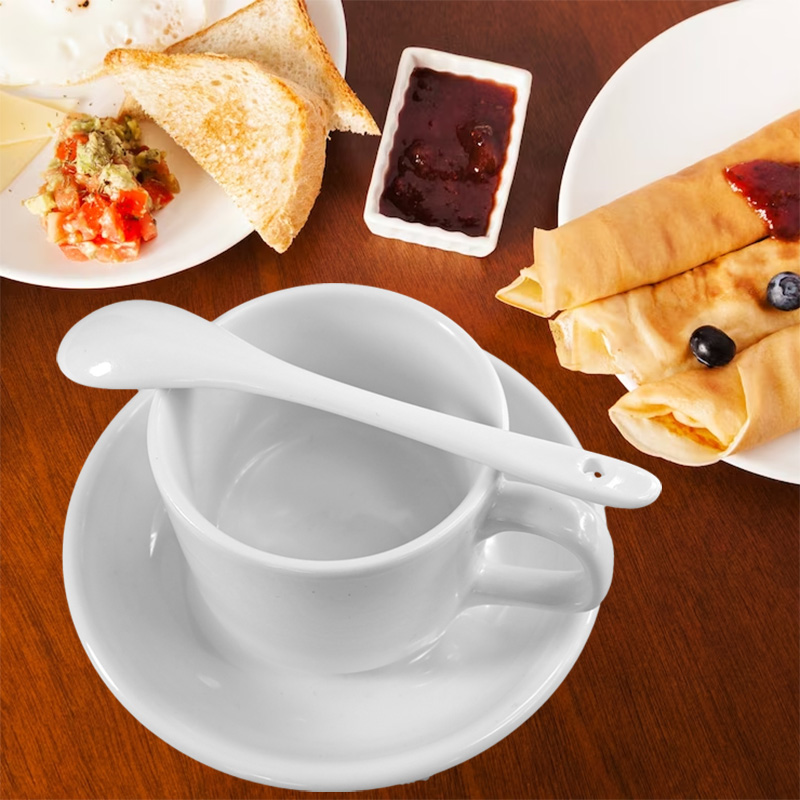 White coffee cup with saucer and spoon can be a stylish and elegant gadget for clients or cute personal gift for loved ones.