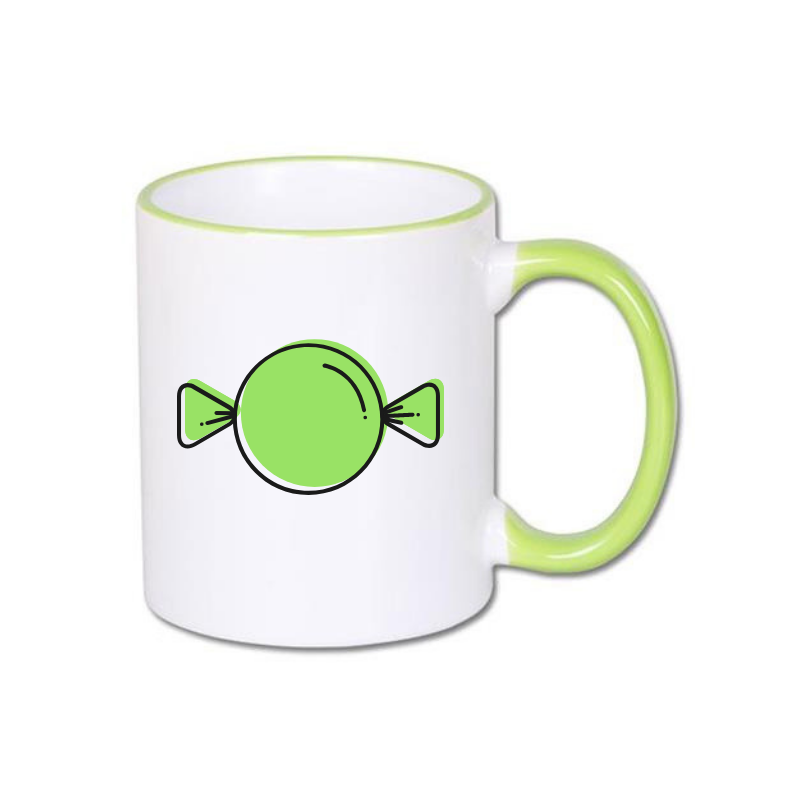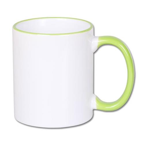 White mug with light green handle, coated with a special polyester for sublimation outprint and transfer laser printers. Mugs with light green grip and light green edge are become more and more popular gadgets. Bicolor mugs are perfect to create interesting personalized projects.