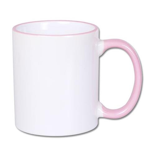 White mug with pink handle, coated with a special polyester for sublimation outprint and transfer laser printers. Mugs with pink grip and pink edge are become more and more popular gadgets. Bicolor mugs are perfect to create interesting personalized projects.