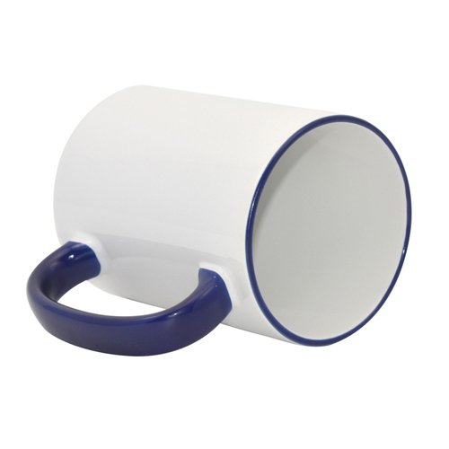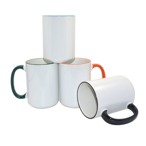 White mug with colorful handle and rim, coated with a special polyester for sublimation outprint and transfer laser printers. Mugs with colorful grip and edge are become more and more popular gadgets. Bicolor mugs are perfect to create interesting personalized projects.