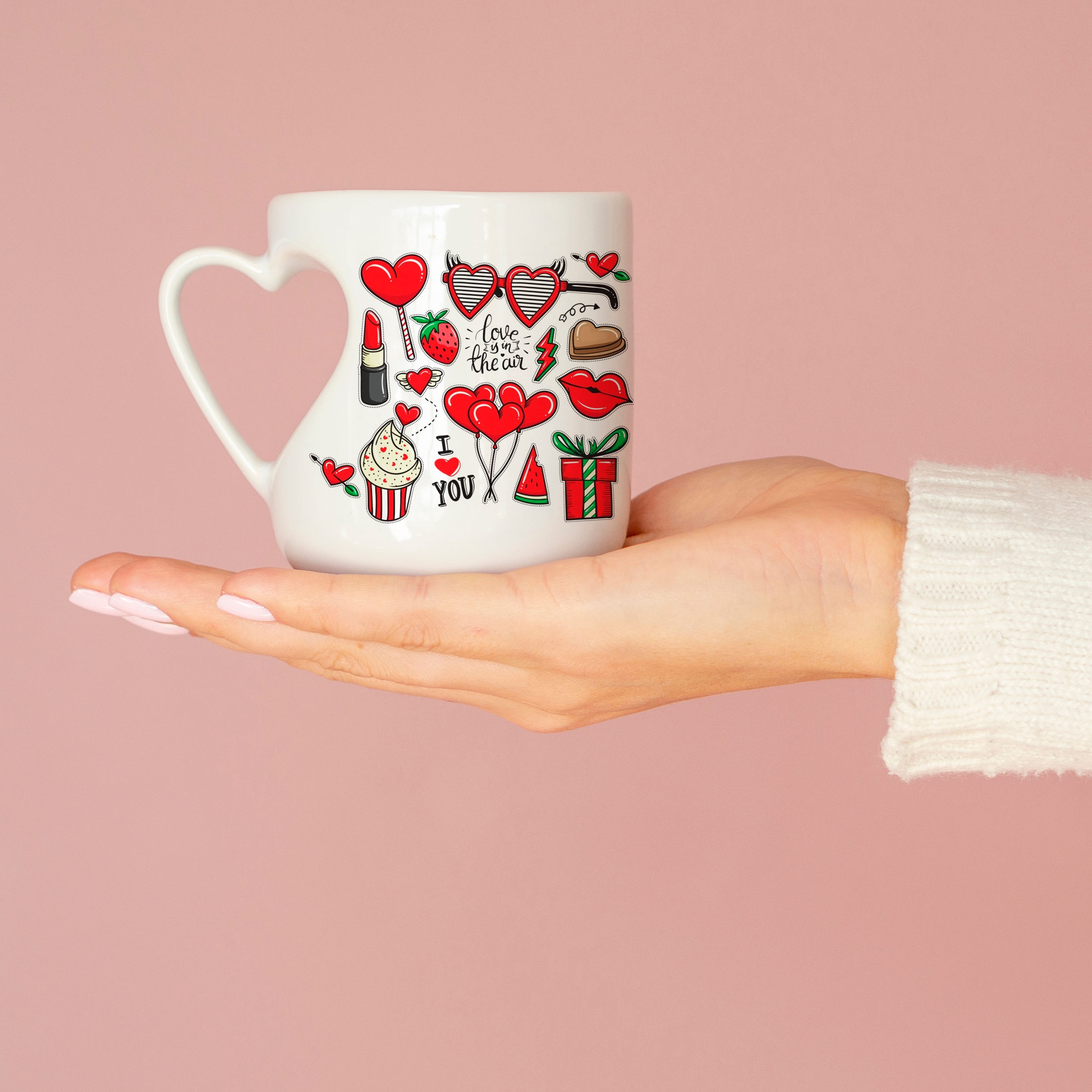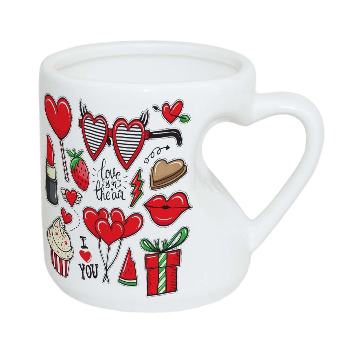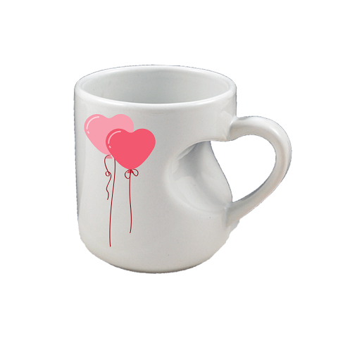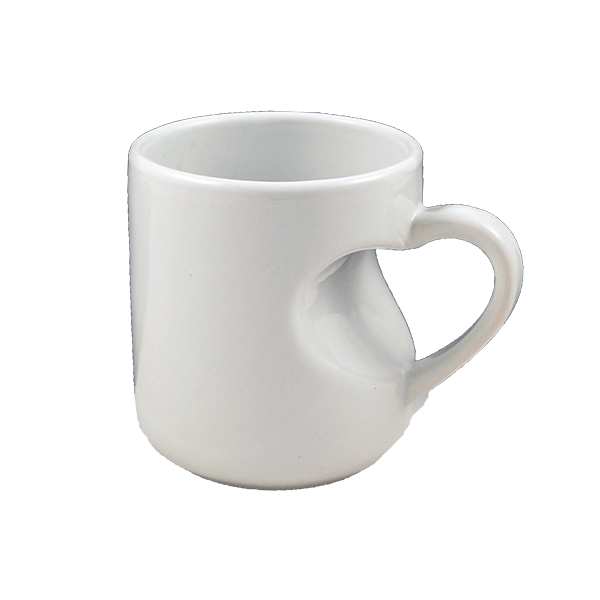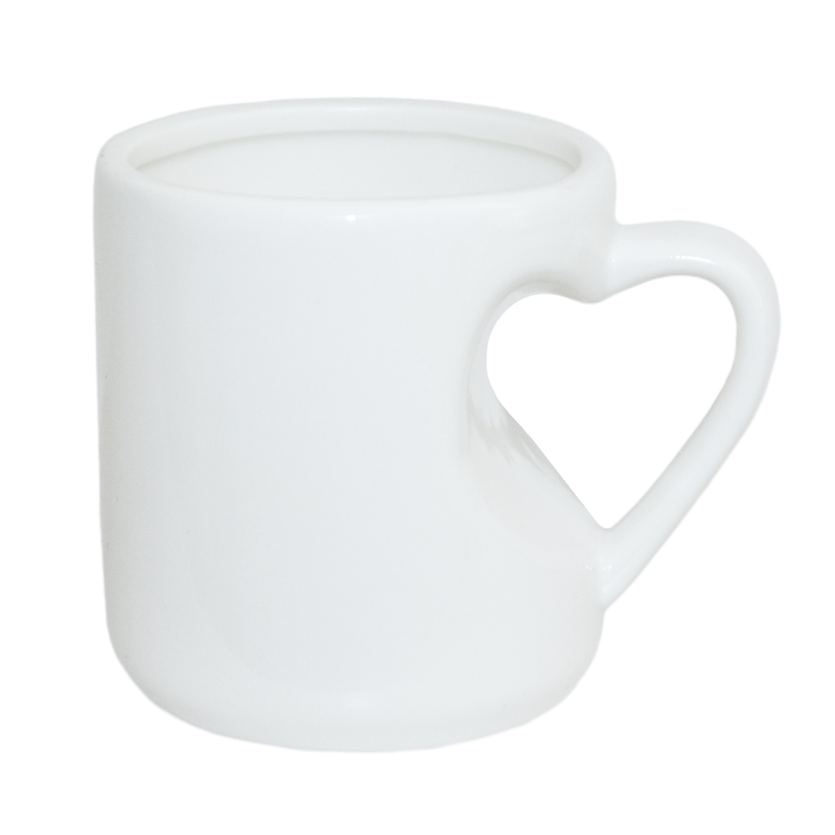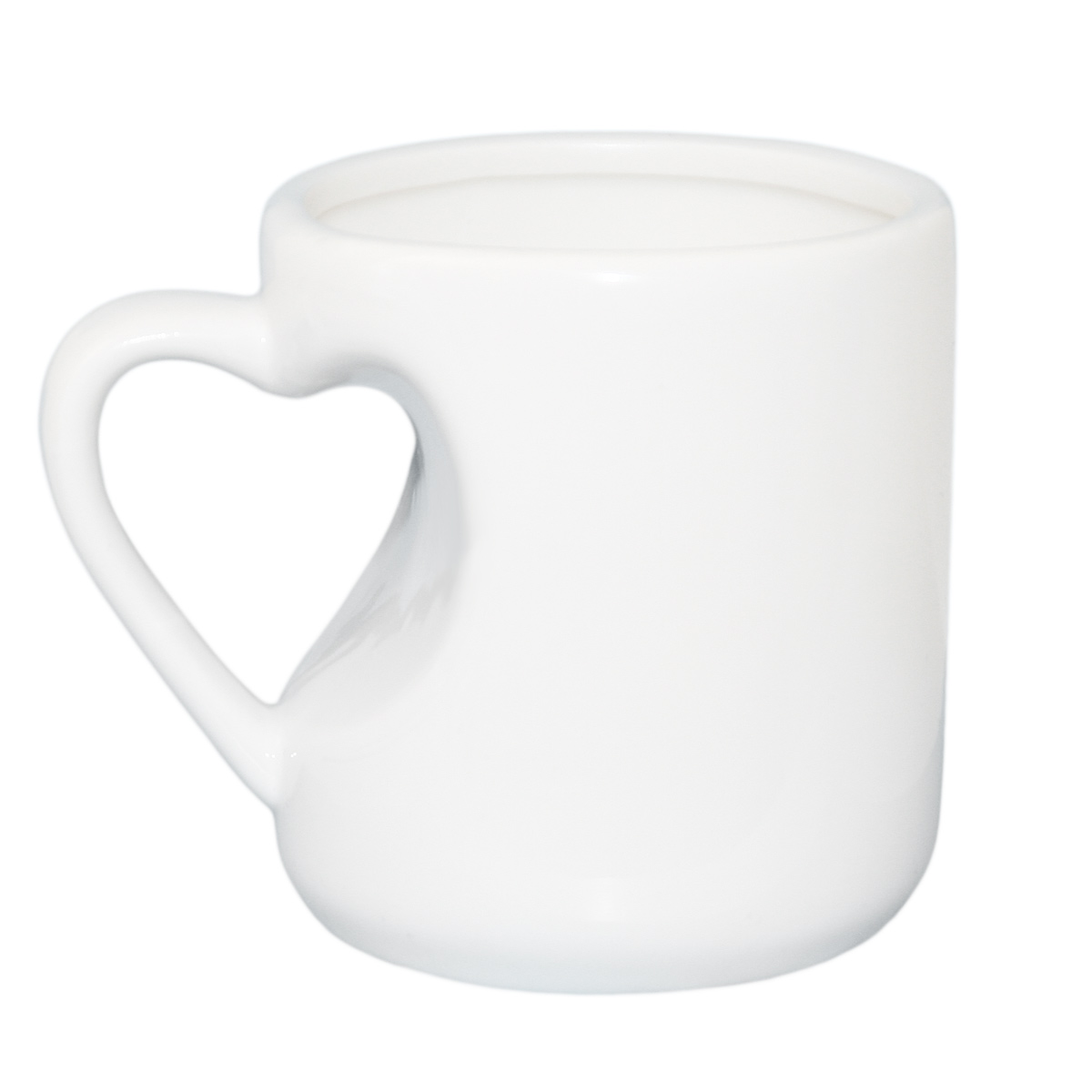 White mug with heart-shape handle, coated with a special polyester for sublimation printout.